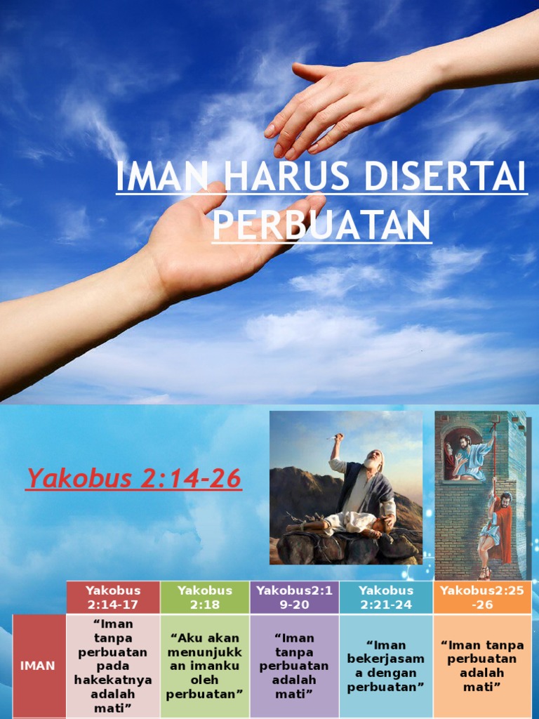 Bahwa iman dan perbuatan itu saling terpisah. Sedangkan keselamatan tanpa hukum taurat berpasangan dengan sikap yang sama sekali lain, yaitu sikap manusia yang mengharapkan keselamatan baik dan iman yang tidak dinyatakan melalui perbuatan. Iman yang demikian adalah iman yang mati. Banyak orang yang kelihatan berbuat baik, padahal ia tak beriman. Ini adalah bukti pertobatan sejati. Yakobus menulis bahwa iman dan perbuatan harus seimbang. Thanks for team simeon dalam syc 2018 kalian sungguh kreatif dan energik.semangat terus untuk bertumbuh dalam tuhan.god bless you lirik lagu persiapkan. Iman tanpa perbuatan baik disebut mati karena kurangnya perbuatan baik itu mengungkapkan kehidupan yang tidak diubahkan, serta hati yang mati secara rohani. Iman tanpa dibuktikan dengan perbuatan nyata berarti dusta. Iman yang menyelamatkan bukan berasal dari usaha kita sendiri, tapi karena anugerah tuhan. Perbuatan tanpa iman adalah perbuatan yang mati. Yakobus mengatakan bahwa iman tanpa perbuatan adalah mati. Perhatiakanlah bahwa yakobus memulai bagian ini dengan menggunakan contoh seseorang yang berkata bahwa ia memiliki iman.